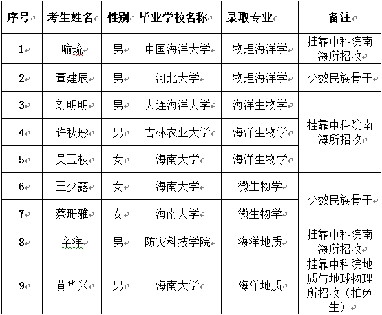 2014年三亞深海所攻讀碩士學位研究生擬錄取名單(含推免生)