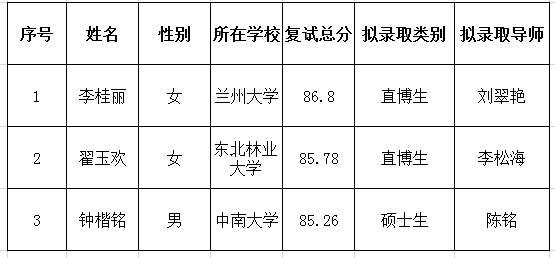 根據(jù)教育部、中國科學(xué)院大學(xué)相關(guān)文件精神,本著“公平公正、全面衡量、保證質(zhì)量、寧缺毋濫”的原則,通過對考生面試、政審以及體檢等綜合考核,經(jīng)深海所招生工作領(lǐng)導(dǎo)小組審核批準(zhǔn),李桂麗、翟玉歡2位同學(xué)根據(jù)本人申請并通過考核,被擬錄取為深海所推薦免試直博生、鐘楷銘同學(xué)被擬錄取為深海所推薦免試碩士研究生。現(xiàn)將擬錄取名單予以公示,公示期十個工作日。