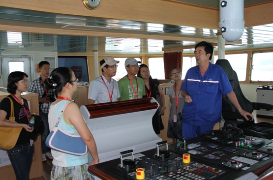 “科學”號船長隋以勇詳細介紹了“科學”號的船舶設計、建造過程以及各項參數性能。考察團一行參觀了駕駛室、綜合儀器室、實驗室、機艙、絞車艙、作業甲板等工作場所,以及住房、餐廳、休閑、健身等生活場所,對船舶動力定位、減搖水艙功能和綜合科學考察能力進行了詳細了解。