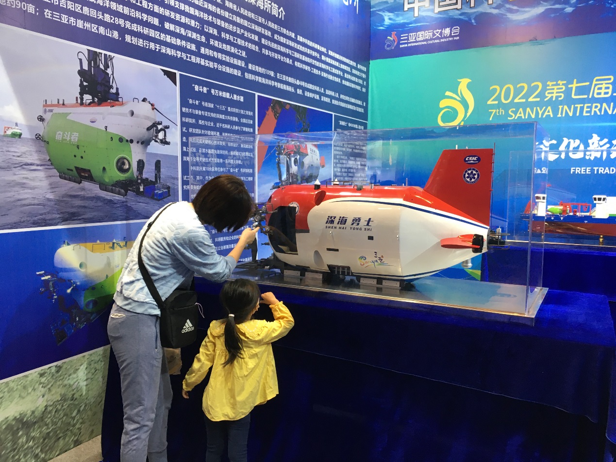 本屆文博會主會場設在三亞市紅樹林國際會展中心,設有“海上絲路”文化展、全球文旅精品展、中華文化帶展、自貿港文化展、科技文化展等五大專題展區及“云上文博”線上直播展廳。深海所受邀作為“海上絲路”文化展單位展出深海勇士號、“奮斗者”號載人潛水器模型以及“探索一號”科考船模型,并通過播放科考紀錄片形式,幫助觀眾了解載人潛水器深海科考的作業場景和“奮斗者”號的海試過程成果受到市民的關注。