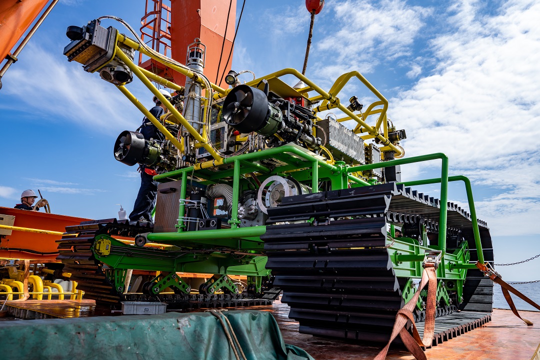 深海底爬行式移動作業系統作為深海科學調查設備的搭載平臺,滿足高負荷、大質量、需要穩定支撐的科學儀器及考察裝備的海底科考需求,該系統具備履帶式行走機構,具備海底移動作業能力,同時采用輕量化設計,滿足海底沉積物稀軟底質的行駛條件,并且通過更換不同形式的履帶,實現海底多種復雜條件的行走功能。本次海試的最大深度到達4098米,履帶行走模塊,液壓模塊及控制系統運行正常,并搭載了矢量推進器、智能作業機械手及海底破碎收集模塊開展試驗,系統整體運行良好,順利完成海上驗收。