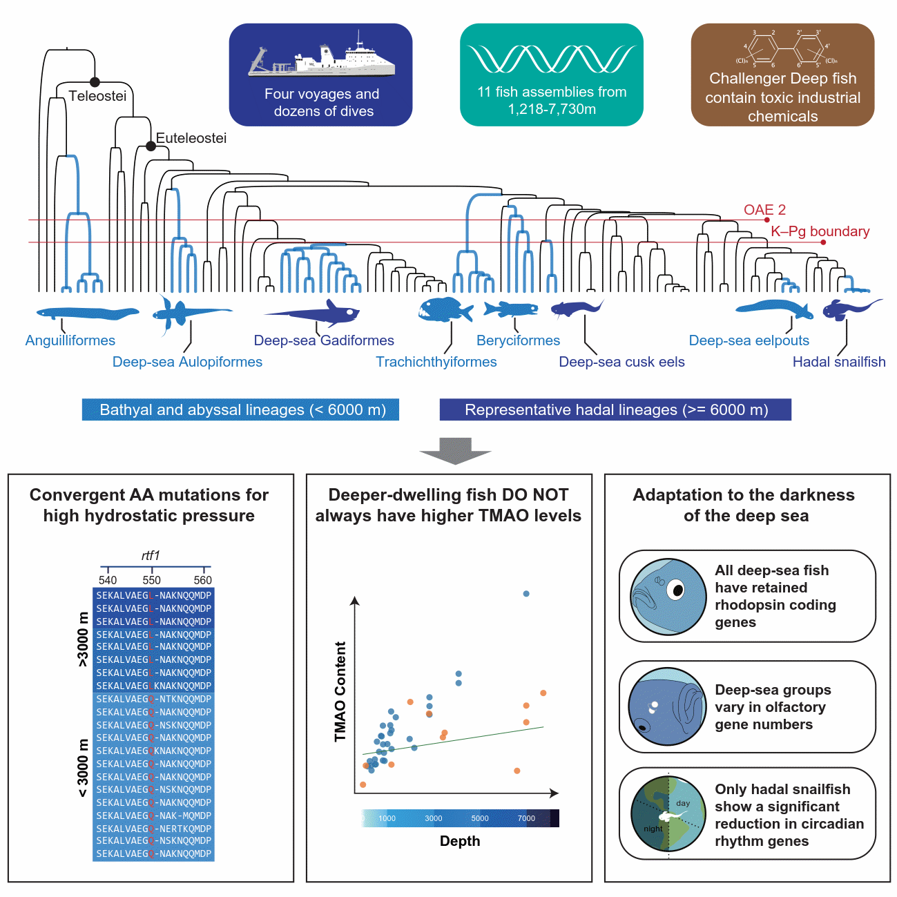 研究對從西太平洋至中印度洋海域,深度1218米到7730米水深,超深淵海溝、海盆和斷裂帶,熱液區(qū)及中國南海海域捕獲的11種深海魚類的基因組數(shù)據(jù)進(jìn)行深入分析,構(gòu)建了深海魚類的"生命進(jìn)化樹",揭示了脊椎動物征服深淵的史詩歷程。結(jié)果表明,大多數(shù)現(xiàn)存的深海魚類約在6500萬年前的大滅絕事件后才進(jìn)入深海區(qū)域,而少數(shù)更古老的深海魚類類群在1億年前就已經(jīng)開始適應(yīng)深海環(huán)境,并可能在連續(xù)的大滅絕事件中存活。進(jìn)一步的研究發(fā)現(xiàn)深海魚類基因組展現(xiàn)出較低的突變速率和較高的重復(fù)序列比例,同時,對深海黑暗環(huán)境也表現(xiàn)出不同層次的適應(yīng)性變化。