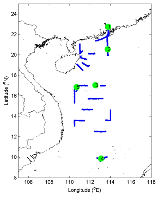 (藍(lán)色線條為本航次鯨豚類動(dòng)物考察航跡,數(shù)字為海豚發(fā)現(xiàn)地點(diǎn))